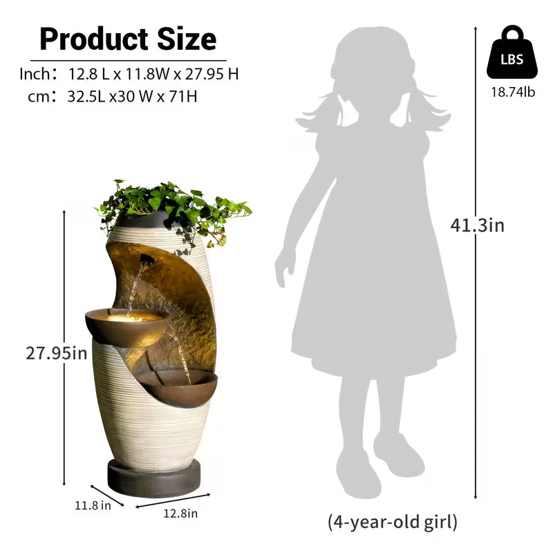 Crafted from durable, weather‑resistant resin, it’s lightweight yet sturdy enough for year‑round use on patios, in gardens, by entryways, or inside your home. Built‑in LED lights illuminate the flowing water, creating a warm, inviting glow during evenings and nighttime.