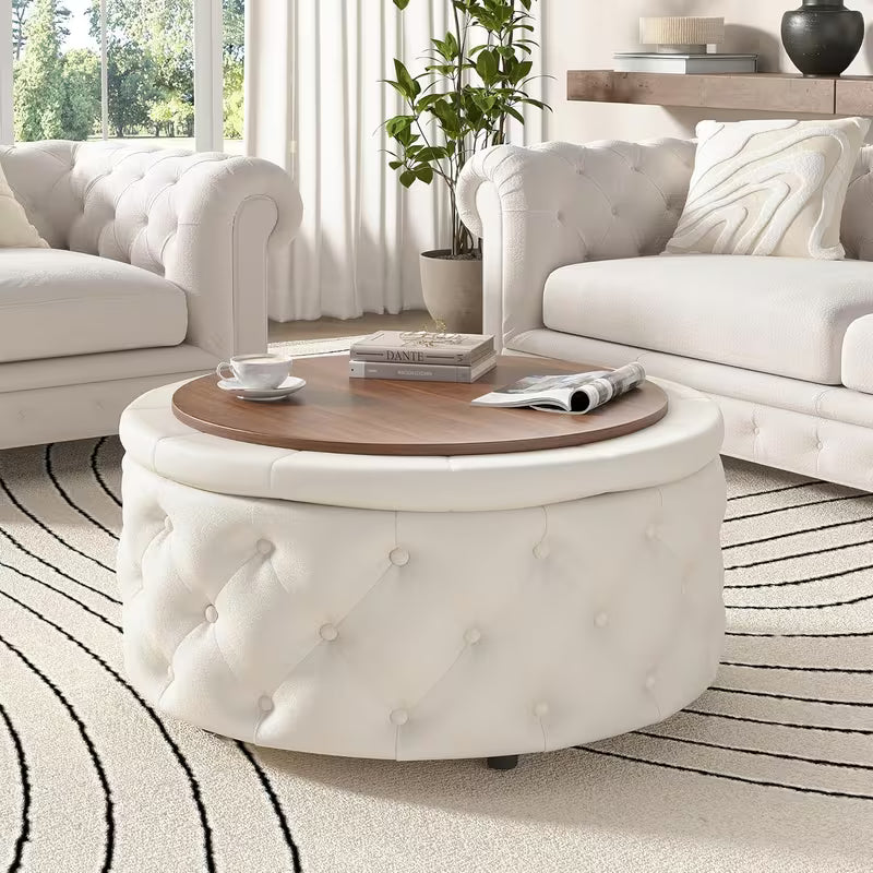 30" Round Storage Ottoman with Removable Lid & Reversible Tray – Button‑Tufted Coffee Table Footrest (Cream White)