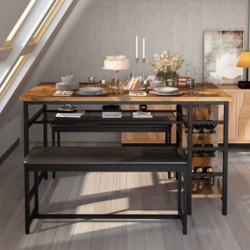 53" Space‑Saving 3‑Piece Dining Table Set with Wine Rack, Glass Holder & Storage – Table + 2 Benches (Brown)