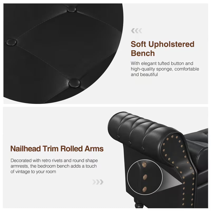 Designed with rolled arms, nailhead trim, and tufted faux leather upholstery, this bench blends timeless elegance with everyday functionality.