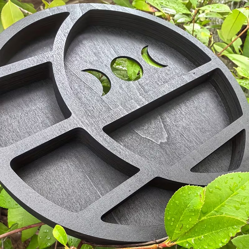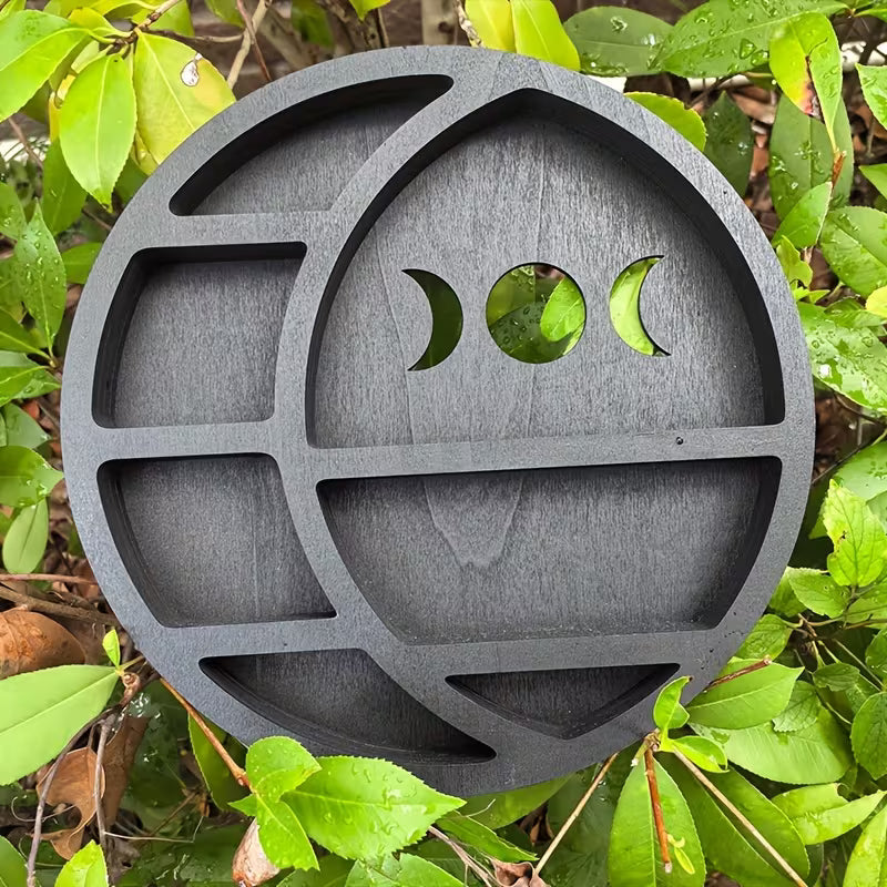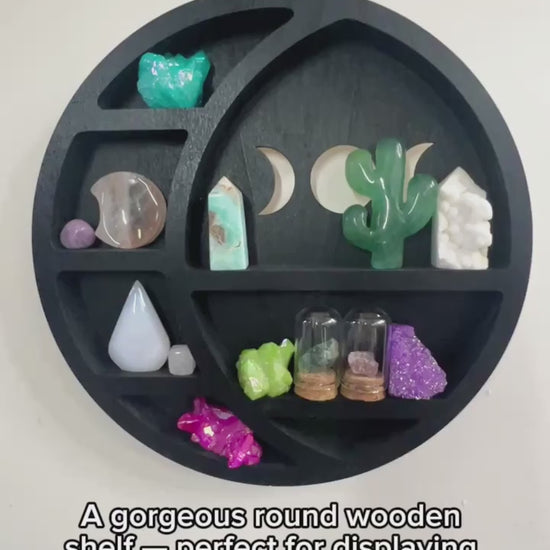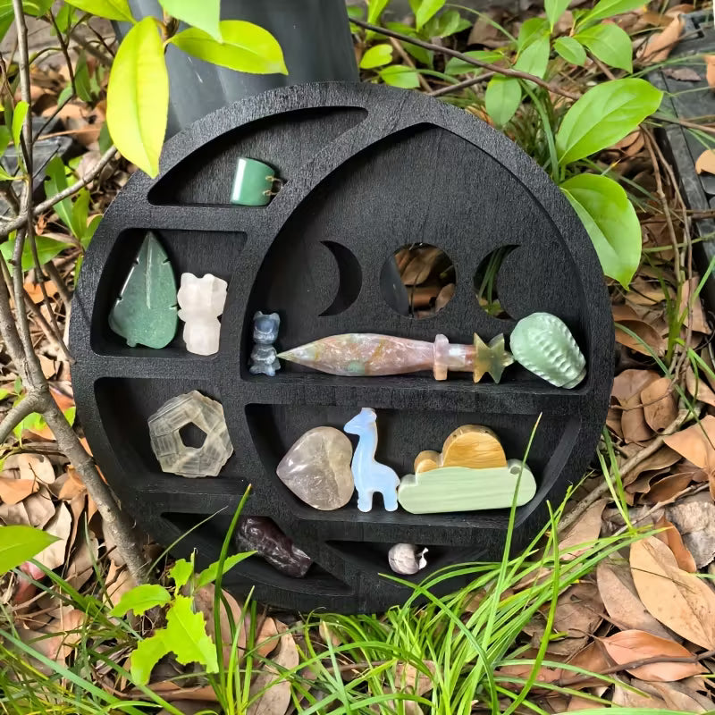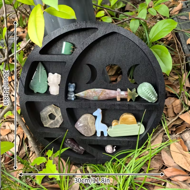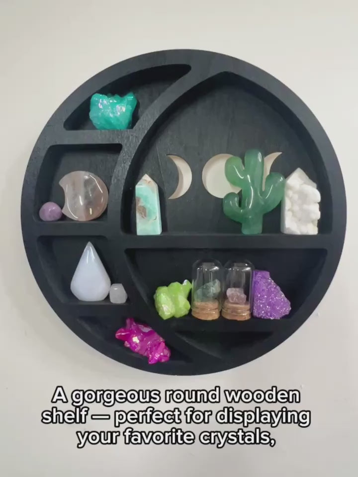 Showcase your crystals and small décor pieces with this Crystal Wooden Moon Shelf Set, featuring both a crescent‑moon shelf and a matching round shelf.
