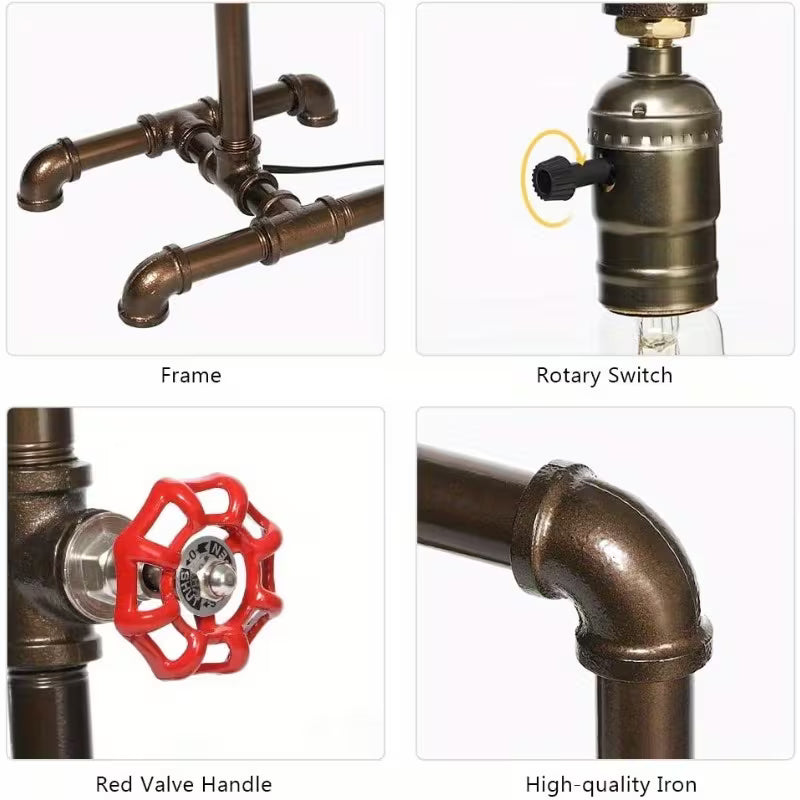 Industrial Steampunk Desk Lamp – Rustic Bronze Metal Pipe Lamp with Red Valve & Exposed Bulb Design (Bulb Not Included)