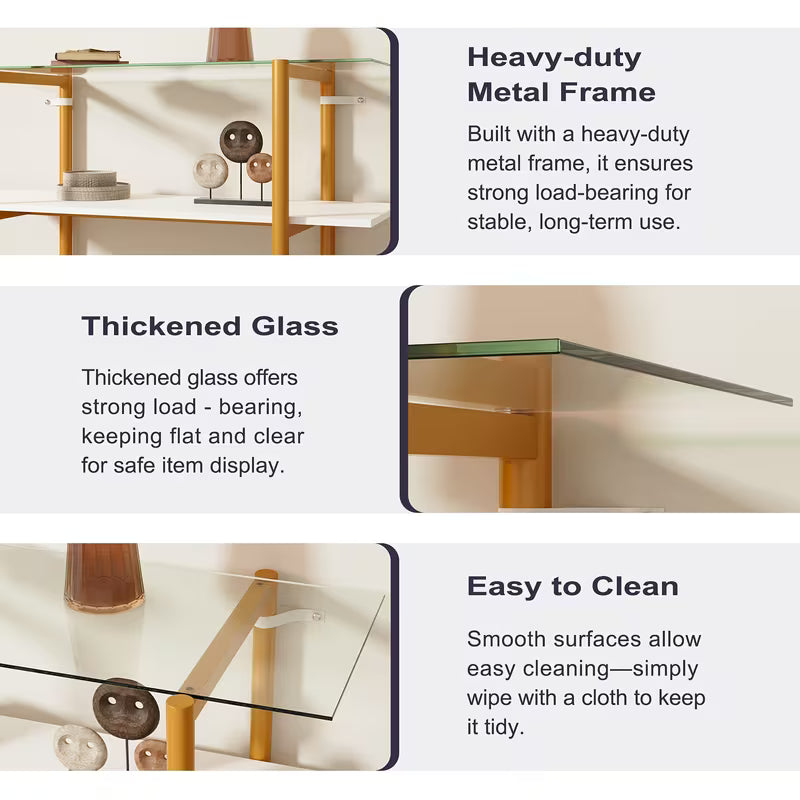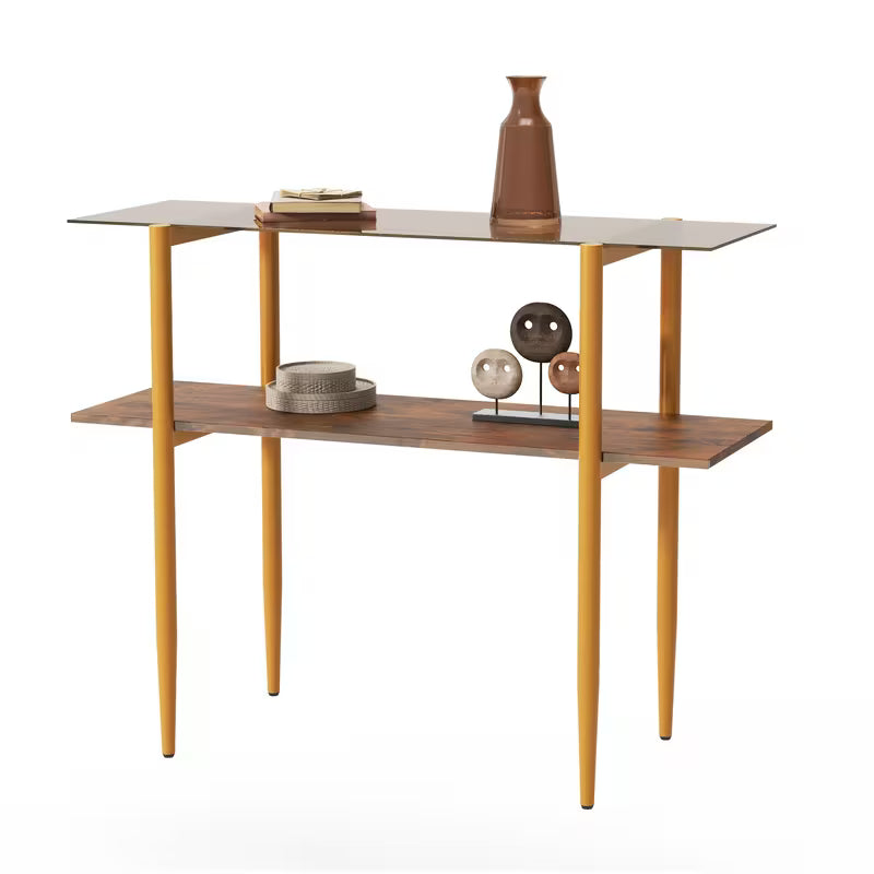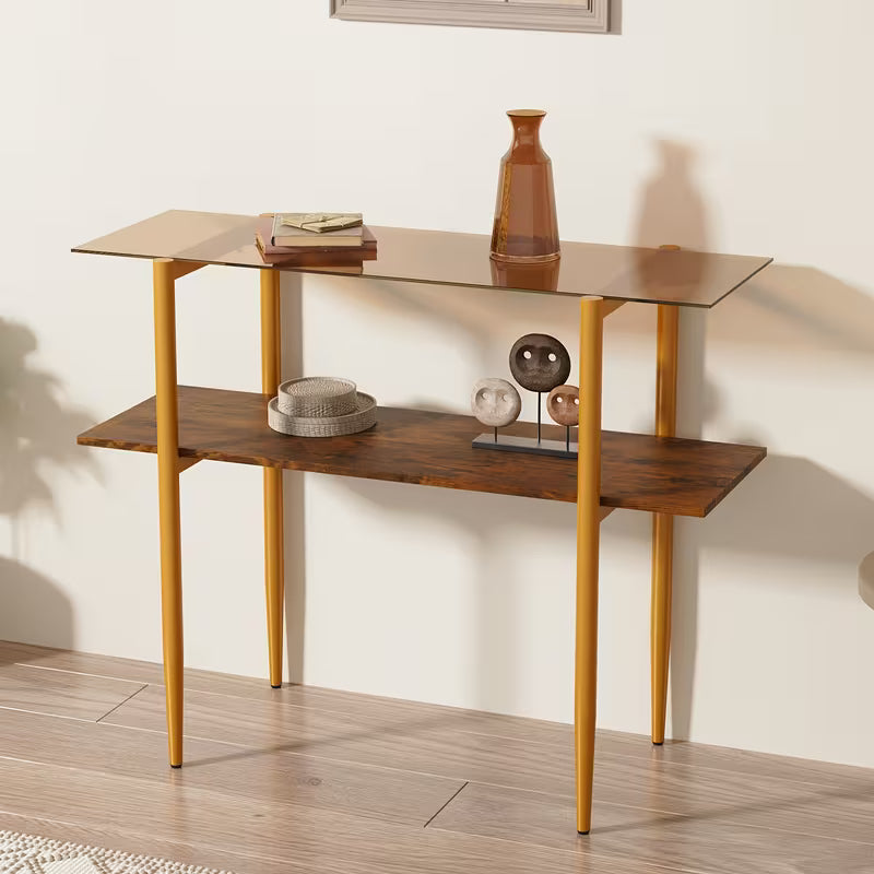 Its slim, space‑saving profile makes it ideal for behind‑sofa placement, narrow hallways, or modern entryways. The combination of glass, metal, and wood‑tone accents creates a clean, contemporary look that blends seamlessly with mid‑century, minimalist, and modern interiors.