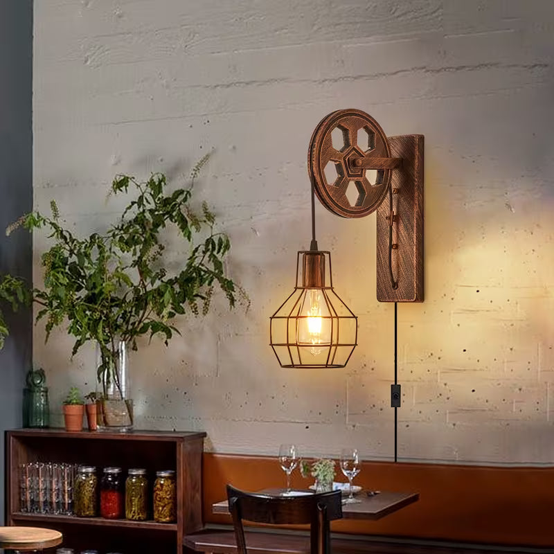 Plug‑In Industrial Wall Lamp Set (2‑Pack) – Retro Farmhouse Cage Sconces with Pulley Bracket & Switch (E26, Bulbs Not Included)
