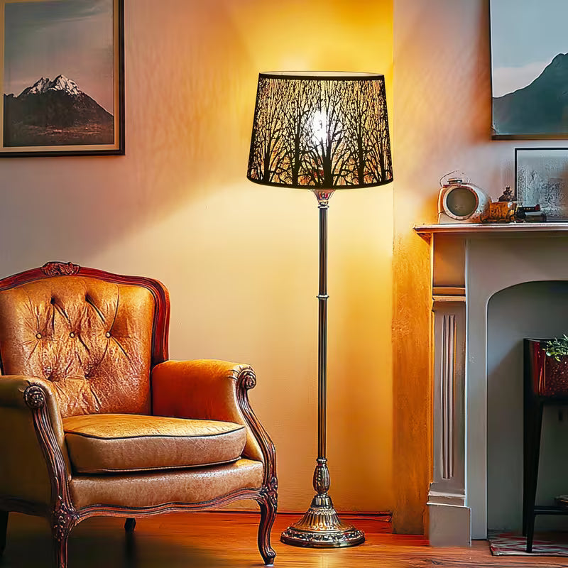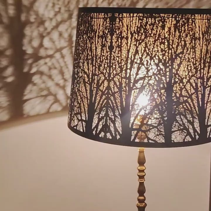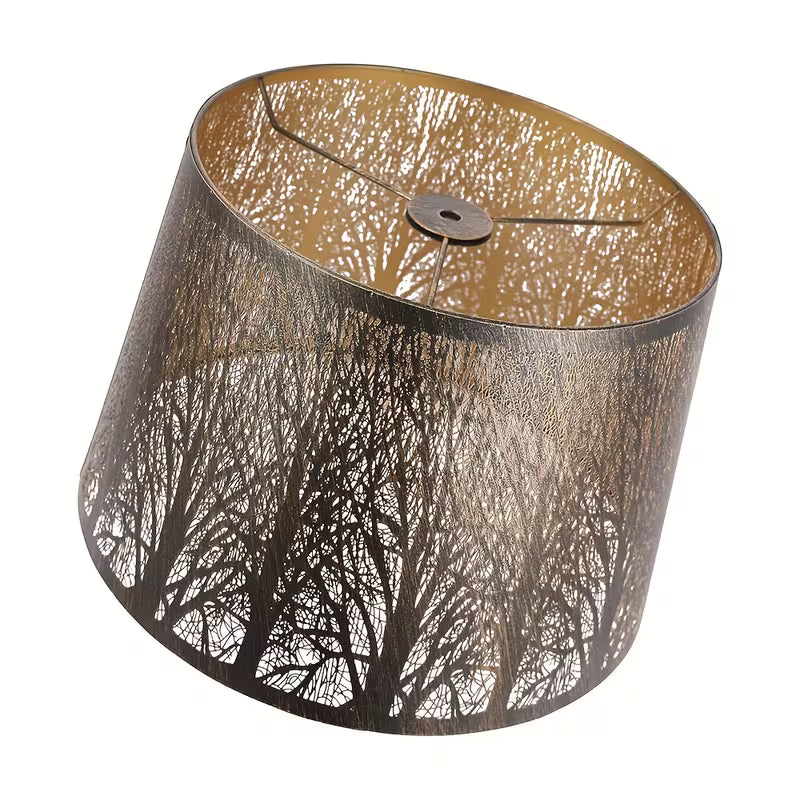 Elevate your lighting with this Tree of Life Drum Lampshade, crafted from a single etched metal plate to create a stunning perforated forest silhouette. When illuminated, the intricate cutouts cast warm, artistic shadows that transform any room into a cozy, atmospheric space.