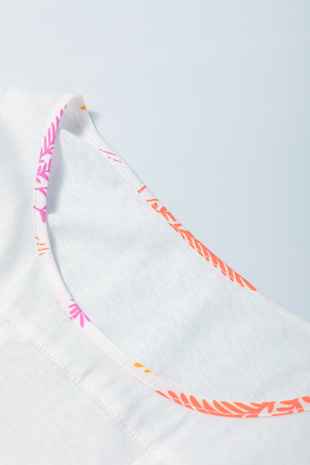 White Tropical Leaf Printed Patchwork Sleeve Round Neck Top